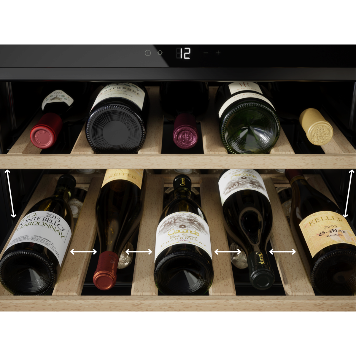 Perfect Shelving ile tüm koleksiyonunuzu sergileyin. Geniş ızgaralar, kaliteli ahşap, teleskobik kızaklar ve ideal boşluklar ile en sevdiğiniz şampanyalar da dahil olmak üzere tüm 750 ml şişe tiplerini etiketlerini çizmeden sergileyebilirsiniz